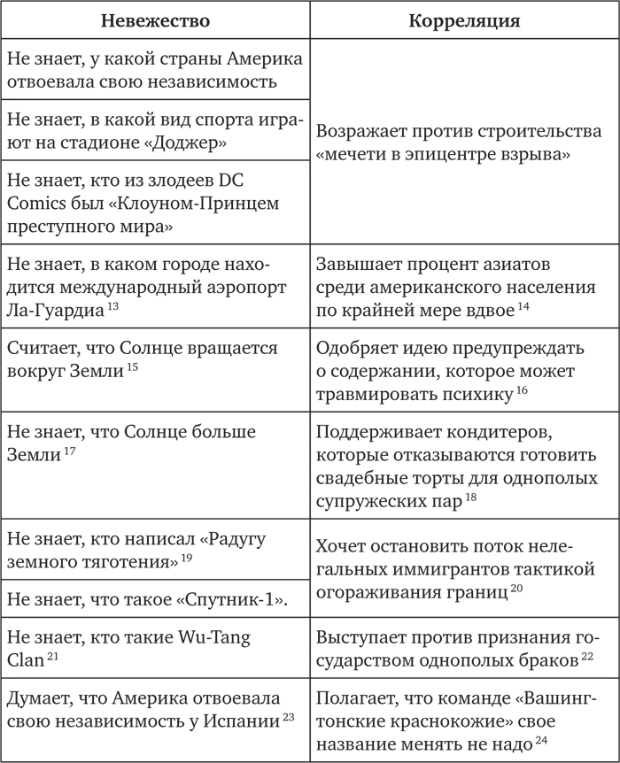 Даже с отдельными вопросами обнаружилась четкая корреляционная связь[314]. Те, кто не знали, в какой вид спорта играют на стадионе «Доджер»[315], чаще возражали против строительства здания, которое, по сути, мечетью не является. То же самое касается опрошенных, которые не смогли сказать, у какой страны Америка отвоевала свою независимость или кто из злодеев DC Comics был «Клоуном-Принцем преступного мира». Можно подумать, раз человек ответить на это не способен, то он наверняка какой-нибудь законсервированный шпион, который так и не усвоил толком спецкурс «Как сойти за американца». Но нет, дело обстоит иначе: неспособность ответить на эти вопросы позволяет вычислить рожденного в США исламофоба.