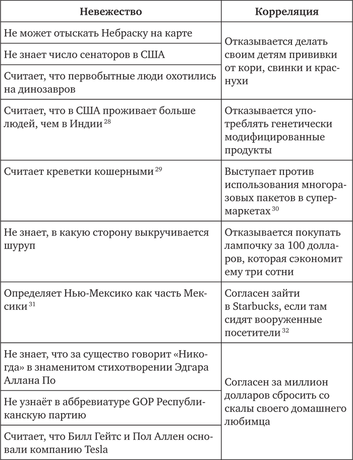 И снова те, кто показал хорошие результаты в тесте на общие знания, оказались более склонны к разумному, осмотрительному и социально ответственному поведению. Испытуемые, ответившие на вопрос о детской вакцинации утвердительно, образуют группу, представители которой с большей вероятностью знают, что люди никогда не жили среди динозавров, способны определить Манхэттенский проект как американскую программу по созданию атомной бомбы, помнят число сенаторов США, понимают, что США превосходят Индию по территории, но уступают ей по населению, и знают, что англо-американская война 1812 г. предшествовала Гражданской войне[320].