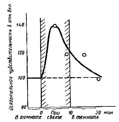 Сюда относятся прежде всего факты изменения порогов в процессе взаимодействия различных анализаторов. Так, например, уже давно физиологами отмечался факт повышенной тактильной чувствительности в условиях освещения, по сравнению с ее уровнем в темноте (Введенский, Годнев, Добрякова). Этими же авторами был установлен факт изменения пространственного порога при действии светового раздражителя, подтвержденный позднее в опытах Добряковой (рис. 1).