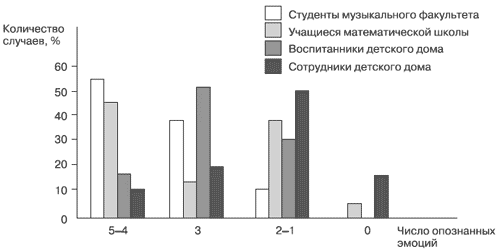 А. Х. Пашина (1992) показала, что одинаковый у двух субъектов процент опознания всех эмоций может быть различным при разном количестве правильно опознанных эмоций. В связи с этим она выдвинула представление о структуре эмоционального слуха. Ею было установлено, что испытуемые по-разному опознают количество предъявленных эмоций: одни – все пять, другие – четыре, третьи – три и т. д. Большее количество эмоций опознают музыканты, затем учащиеся математической школы, еще меньше – работники детского дома и самое меньшее число правильных опознаний было у учащихся выпускного класса детского дома (рис. 9.3).