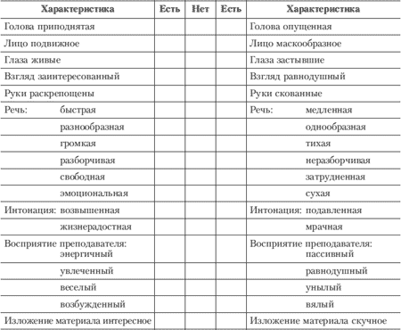 Методика разработана Н. П. Фетискиным и связана с экспертной оценкой мимических, пантомимических, вербальных и других характеристик преподавателя во время проведения им урока, чтения лекции.