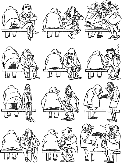 Рис. П2.5. Карикатура Х. Бидструпа на предмет того, как поведут себя в одной и той же ситуации холерик, флегматик, меланхолик и сангвиник