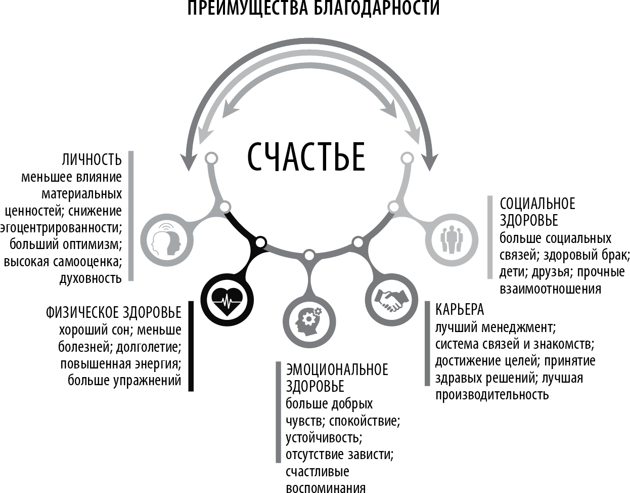 Сосредоточенность на благодарности усиливает активность парасимпатической нервной системы и понижает маркеры воспаления[138]; она избавляет от депрессии и позволяет радоваться жизни[139], снижает уровень стресса у родителей и опекунов[140], а у пожилых людей существенно уменьшает тревожные симптомы наряду с возвращением ярких воспоминаний, ощущением удовлетворенности и субъективного счастья[141].