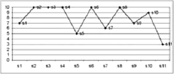Графически результаты опроса представлены на рисунке в виде феноменологического профиля личности. Номера маркеров обозначают номера шкал опросника «ФПЛ», измеряемых в интервале от 1 до 10 стенов. Профиль позволяет в короткий промежуток времени составить представление о структуре и интенсивности проявления конкретных феноменов ложной информации конкретного индивида.