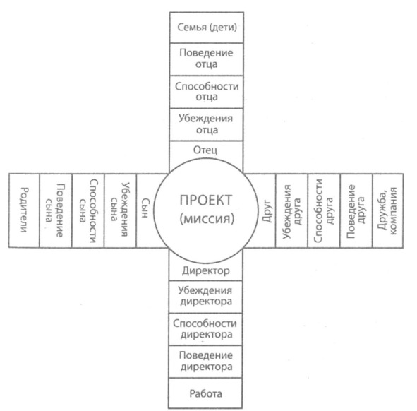 В результате получается следующая картина: Проект (или Миссия), находящаяся в центре, как солнце, и нейрологические уровни, подобно лучам, расходящиеся в разные стороны. На концах «лучей» – жизненные контексты. Конкретные ситуации, в которых человек действует определенным образом: работа, семья, дружеская компания, обучение и т. д.