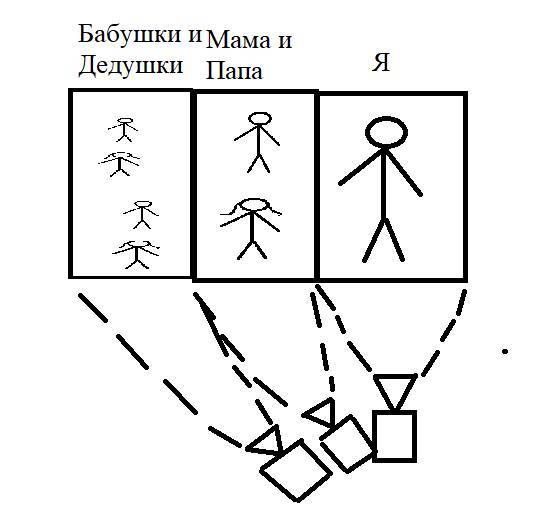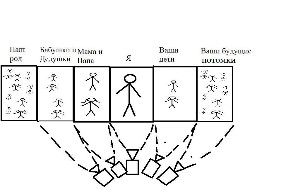 Давайте представим себе, что камера движется еще левее. Теперь мы видим уже детство, юность и жизнь наших родителей, мы видим, как формировались их "слепки".