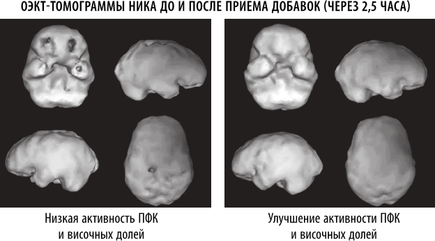 Я сказал Нику, что знаю действие добавок, но не знаю, как быстро они подействуют для него. Мое предложение заключалось в следующем: он приходит ко мне на следующий день в 8.00, приняв добавки, а в 10.30 мы просканируем его мозг. Нику не терпелось узнать, помогут ли ему наши добавки, и они помогли (см. его ОЭКТ-томограмму на предыдущей странице). На втором изображении можно видеть заметный приток крови к мозгу, особенно в области ПФК и височных долей. Это не значило, что он выздоровел после одной дозы добавок, но означало, что его мозг обладает потенциалом восстановления, если он будет вести здоровый образ жизни и регулярно принимать добавки.