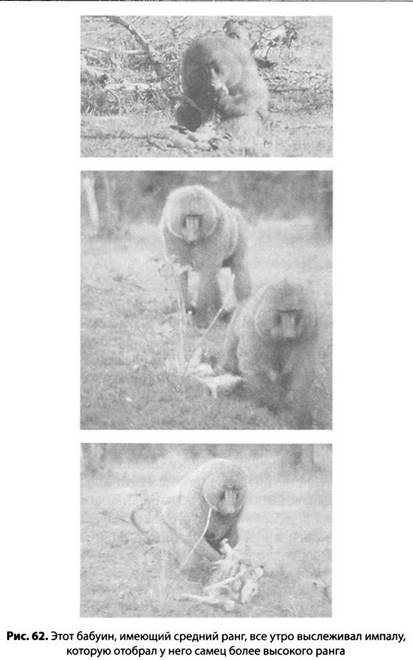 Приматы довели иерархическую конкуренцию до наивысшей степени сложности, которая только доступна животным. Рассмотрим, к примеру, бабуинов — обезьян, живущих в саваннах крупными стаями, насчитывающими до сотни особей. В одних случаях иерархии могут быть подвижными и допускающими перемещение по вертикали, в других же случаях место в иерархии оказывается наследуемым и пожизненным. В каких-то случаях ранг особи может зависеть от ситуации: А может считаться старше В в споре за пищу, но младше в споре за особь противоположного пола. В иерархиях возможна также цикличность смены мест — А смещает В, В смещает С, С смещает А. Место в иерархии может завоевываться с помощью коалиционной поддержки — В терпит поражение от А, если своевременно не получает помощи от С; в противном случае именно А отправляется в отставку. Фактическая конфронтация между двумя животными может принимать самые разные формы — от чуть ли не смертельной драки до угрожающих телодвижений, способных вызывать у рядовых особей нервную дрожь.