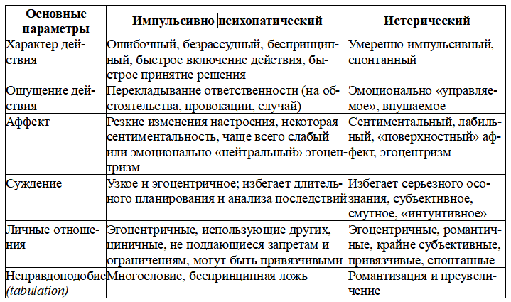 Таким образом, психопатический и истерический характеры представляют собой два пассивно-реактивных типа, которые в разной степени избегают планируемых, рефлексивных, намеренных действий, и тревожное ощущение действия в первом случае в основном предупреждается, а во втором, по крайней мере, существенно снижается. Хотя между основными, формальными факторами двух разновидностей личности, таких как основное свойство аффекта, быстрота или ситуативность реакции и ощущение действия, можно показать наличие соответствующей связи, эти два состояния различаются и становятся более индивидуальными в своих проявлениях и особенностях симптоматики (табл. 1).