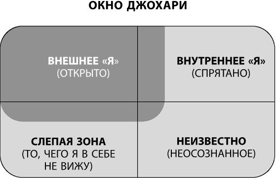 Внешнее «я» (открыто) сочетает все, что я знаю о себе сам и что обо мне знают другие. Если этот квадрат становится больше, то растет открытость. Так бывает, когда вы начинаете лучше чувствовать людей и лучше к ним относиться. Когда я использую свою силу и узнаю свои слабости, внешнее «я» растет.