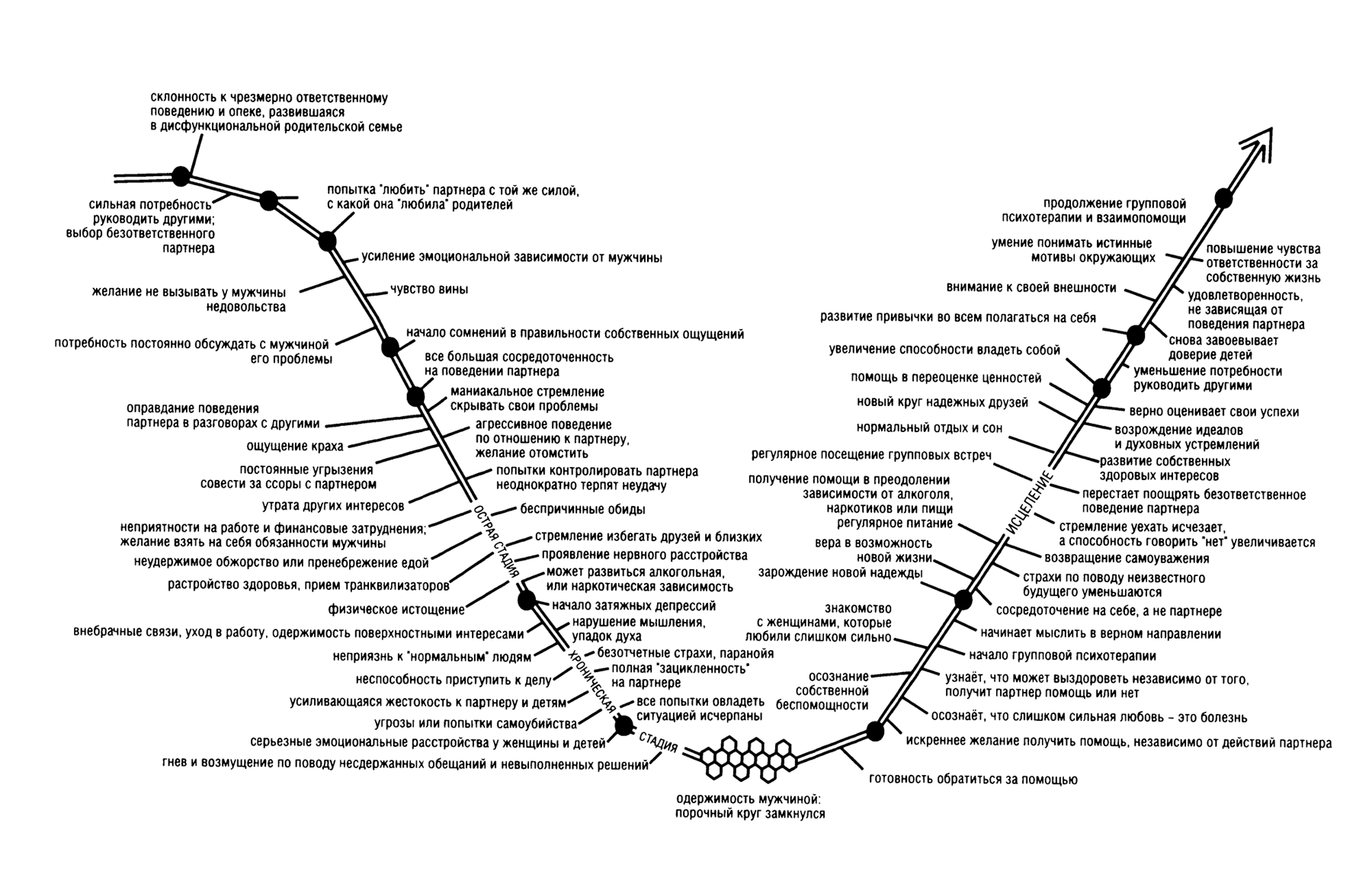 К тому же следует помнить, что история Марго не основана на графике, и он построен не для того, чтобы проиллюстрировать именно ее. Просто с каждым партнером она проходила те же самые последовательные стадии болезни, которые другая слишком любящая женщина прошла бы с одним партнером. Если такая зависимость от отношений, как слишком сильная любовь, представляет собой болезнь, сходную с алкоголизмом, то ее стадии столь же определимы, а течение столь же предсказуемо.