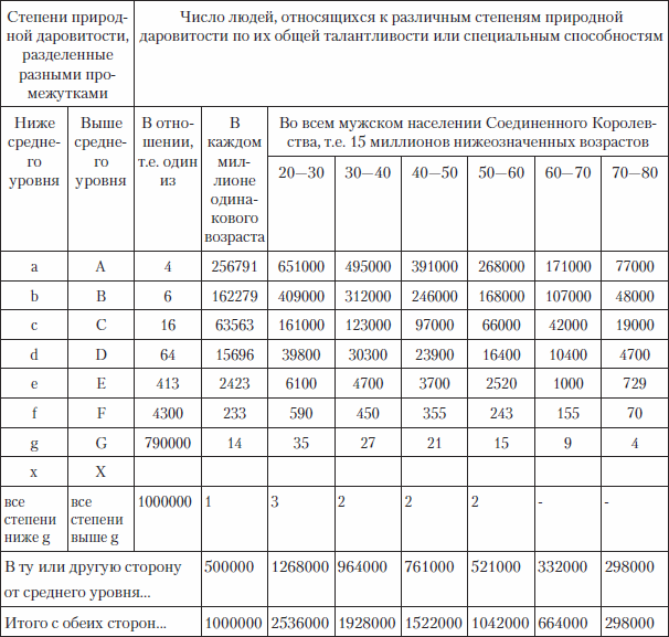 Чтобы доказать, что талант наследуется, Ф. Гальтон рассмотрел более 300 семейств, имеющих в числе своих членов знаменитостей. Среди них он выделил 415 человек, отмеченных особой даровитостью. По его подсчетам, они составляют не более 0,025 % мужского населения. Ф. Гальтон включил в круг своих интересов широкий спектр способностей. Им были собраны материалы, касающиеся родословных не только знаменитых полководцев, государственных деятелей, литераторов, художников, музыкантов, ученых, английских судей, но и выдающихся спортсменов, особо отличившихся в гребле и борьбе. В целом в 300 рассмотренных семействах Ф. Гальтон насчитал до 1000 выдающихся людей. В таблице ниже приводятся данные, касающиеся встречаемости одаренности среди родственников знаменитых людей.