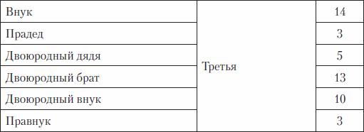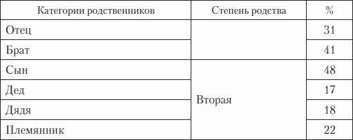 Таблица 2. Количество знаменитых и выдающихся людей всех разрядов (в %) среди родственников гениальных людей