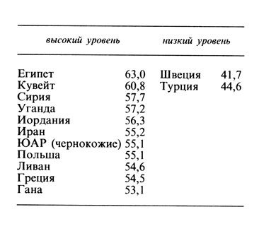 Сравнивая данные, приведенные в табл. 5.9, с данными столбца 5 предыдущей таблицы, мы можем убедиться, что по показателям невротизма лидируют ближневосточные страны (Египет, Кувейт, Иордания, Сирия и Иран). За ними следуют такие африканские страны, как Гана и Уганда, европейские страны (Франция, Греция и Польша) и Япония. В Англии, США, Канаде и Австрии этот показатель значительно ниже, чем в других странах, и замыкают список Швеция и Турция. Обзор, в ходе которого было опрошено 114000 производственных рабочих в 40 странах, показал сходные результаты (Hofstede, 1980).