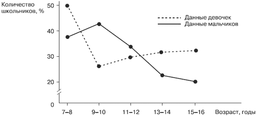 Рис. 14.6. Возрастные изменения числа школьников с высоким нейротизмом.