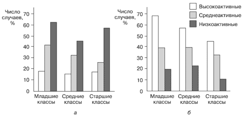 В исследовании Е. А. Сидорова (1983) было выявлено, что чем ниже была активность школьников на уроках физкультуры, тем чаще встречалась высокая тревожность (рис. 14.7).