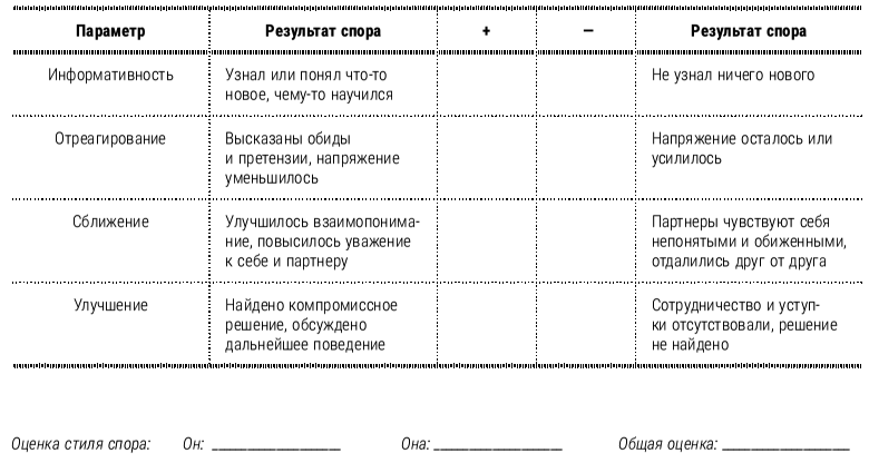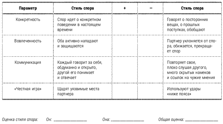 Стиль и результат ссоры каждый супруг оценивает с помощью таблицы. Баллы за удачи и неудачи заносятся в разные колонки и в конце суммируются.