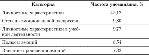 Таким образом, наиболее адекватные ответы на вопрос о качестве выражаемых школьниками эмоций встречаются примерно в 9% случаев (см. в табл. 9.2 категорию «Полюсы эмоций»). Стоит заметить, что учителя не выделяют ни одной модальности эмоций, в лучшем случае говорится о положительных (85,7%) или о негативных (14,3%) эмоциях. Вторая группа характеристик (категории внешнего проявления эмоций и степень эмоциональной экспрессии), отражающая формально-динамические параметры эмоциональности, встречается примерно в 37% случаев и с некоторыми оговорками также может быть отнесена к адекватным ответам.