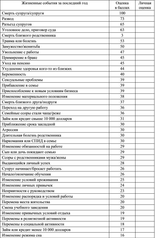 Примечание: Эта шкала включает как стрессовые болезненные события — смерть супруга, развод, потеря работы, так и радостные переживания — брак, беременность, личные достижения. И те и другие вызывают стресс: можно умереть от радостного известия так же, как и от горестного. Стресс является предрасполагающим фактором к развитию рака (у 49 % больных суммарная оценка превышала 300 баллов). Однако еще более значима личная оценка стрессового события и то, как человек справляется со стрессом.