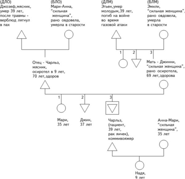 Примечание: Можно сказать, что Чарльз унаследовал свою болезнь и риск ранней смерти из-за преданности семье и связи с предыдущими поколениями: рак поразил сначала его половые органы, как у деда по линии отца, а затем легкие, как у деда по линии матери, причем в том же возрасте — 39 лет. Он согласился на операцию, но отказался от лучевой и химиотерапии. Похоже, что будучи сыном и внуком мясника, он верил лишь в силу ножа. Все женщины в семье — с сильным характером; обе бабушки рано овдовели, что грозит и жене Чарльза. Кроме того, его отец остался без отца в девять лет, и дочь Чарльза рискует потерять его в том же возрасте. Похоже, в семье существует повторяющийся сценарий смерти мужчины в 39 лет, оставляющего после себя девятилетнего ребенка. Обращает на себя внимание созвучность имен женщин: Мари-Анна и Анна-Мари. Проанализировав все это с пациентом, можно попытаться помочь ему перестроить сценарий с ранней смерти на жизнь до старости: любя своего деда, не обязательно умирать, как и он, молодым.