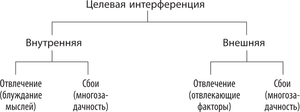 Рис. 1.1. Концептуальная схема целевой интерференции, которая может быть обусловлена как внутренними, так и внешними факторами и вызывается бесполезной для достижения цели информацией (отвлечение) или попыткой одновременного выполнения нескольких задач (сбои).