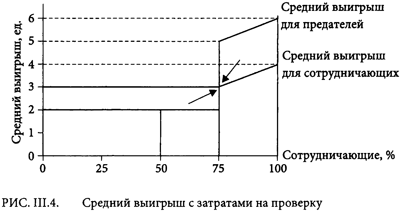 Для величин, предполагаемых в этом примере, средние графики выигрышей для двух групп представлены на рис. III.4. Как отмечалось, прямая сотрудничающих проходит выше прямой предателей для доли менее 75%, но ниже — для более высоких долей. Резкий разрыв в прямых предателей отражает тот факт, что слева от 75% все сотрудничающие платят за проверку, тогда как справа от 75% — никто. Как только доля сотрудничающих в популяции превышает 75%, предатели неожиданно получают доступ к своим жертвам. Правило эволюции, напомним, в том, что более высокие относительные выигрыши ведут к росту соответствующей доли населения. Это правило ясно показывает, что в данном примере популяция придет в равновесие на цифре 75% сотрудничающих.