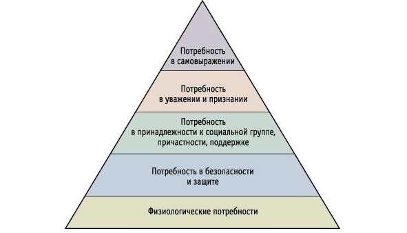 Для ответа на этот вопрос обратимся к теории иерархических потребностей человека Абрахама Маслоу (для нас, русских людей, – просто Маслова). Появившись в 50-х годах XX века, она достаточно быстро закрепилась в качестве значимого маркетингового инструмента под лейблом «Пирамида Маслоу». Несмотря на то, что сам Маслоу никаких пирамид не рисовал (наиболее подробно его идеи изложены в книге 1954 года «Мотивация и Личность» (Motivation and Personality), в адаптированном, «рыночном» варианте, поднятом на щит менеджерами и маркетологами, иерархия потребностей выглядит так, как это показано на рисунке.