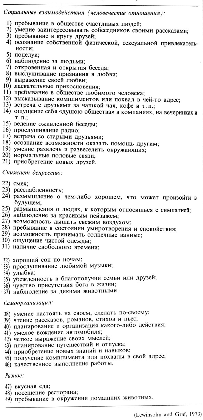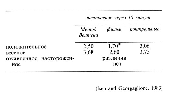 Наиболее известным лабораторным методом является метод, предложенный Велтеном (1968). Он состоит в том, что испытуемых просят читать сначала про себя, затем вслух 50-60 утверждений типа: "Прекрасно! Я действительно хорошо себя чувствую!" "У меня поднялось настроение, я по-другому смотрю на вещи" - и попытаться настроиться на предлагаемое состояние. Позднее этот метод претерпел некоторую модификацию, состоящую в том, что испытуемым давали 20 секунд на каждое из 12 предлагаемых утверждений и просили попытаться войти в соответствующее настроение (Teasdale and Russell, 1983). Одни утверждения касались компетенции и самооценки своих достоинств, другие - физических ощущений, характерных для данного настроения. Вне всякого сомнения, метод Велтена вызывает положительное настроение у широкого круга пациентов, однако продолжительность эффекта при этом методе ограничивается всего 10-15 минутами (Frost and Green, 1982). Более того, согласно имеющейся статистике, этот метод оказывается неэффективным для 30 или даже 50% испытуемых (Clark, 1983).