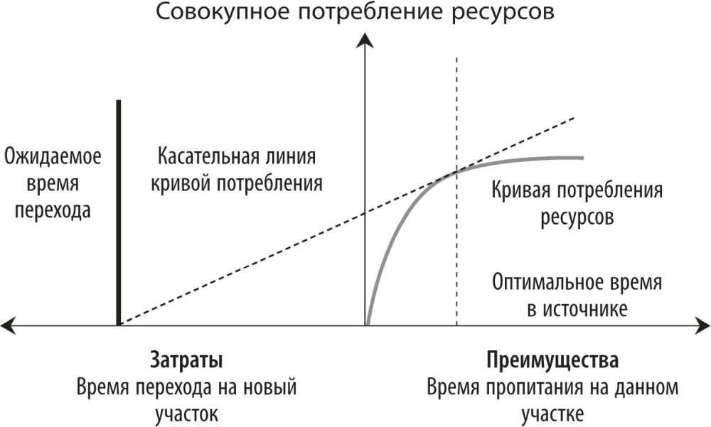 В главе 1 мы представили теорему критической пользы (MVT), которая десятилетиями использовалась для объяснения того, как, почему и когда животные тратят время и энергию для перехода к новым местам пропитания, а не продолжают собирать оскудевшие запасы на привычном месте. В простейшей форме, MVT объясняет соотношение затрат и преимуществ при сохранении прежнего места пропитания либо при переходе на новое место, если рассматривать инстинктивное стремление к выживанию как движущую силу для сбора пищевых ресурсов. Способность животного находить пищу, проводя «оптимальное время» в одном источнике перед переходом к другому источнику является определяющим фактором его выживания. На рис. 9.1 правая сторона MVT-модели обозначает преимущества продолжения сбора ресурсов в прежнем источнике. Для животных, добывающих пищу, кривая потребления ресурсов, определяющая совокупное потребление ресурсов за период времени, обусловлена в основном внешними факторами, которые указывают на сокращение пищевых ресурсов: например, количество орехов, оставшихся на дереве. Точнее говоря, сколько времени пройдет до того, как белка найдет последний орех? По мере продолжения потребления и уменьшения ресурсов преимущества задержки на прежнем участке уменьшаются, и кривая выходит на плато. Это событие на правой стороне модели взаимодействует с факторами на левой стороне, которые отражают затраты, или время перехода к новому источнику пищи (сколько времени займет переход к новому дереву, полному орехов?). Пересечение этих двух факторов (обозначенное касательной линией к кривой потребления ресурсов) ассоциируется с интуитивным сигналом в мозге животного, который сообщает о том, что оптимальное время пребывания в источнике подошло к концу. У животных, добывающих пищу, таким поведением движет сила инстинкта.