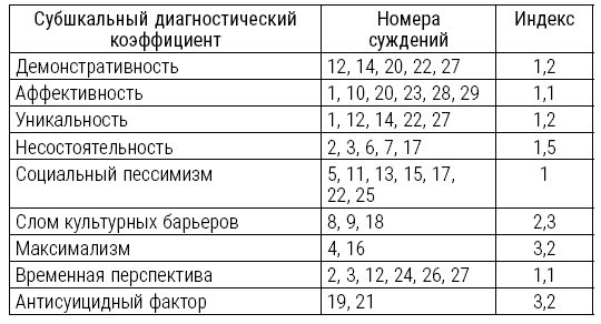 9. Антисуицидный фактор. Даже при высокой выраженности всех остальных факторов есть фактор, который снимает глобальный суицидальный риск. Это глубокое понимание чувства ответственности за близких, чувство долга. Это представление о греховности самоубийства, антиэстетичности его, боязнь боли и физических страданий. В определенном смысле это показатель наличного уровня предпосылок для психокоррекционной работы.