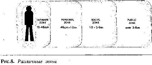 Зональные Пространства. Размеры личной пространственной территории человека средне обеспеченного социального уровня в принципе одинаковы независимо от того, проживает ли он в Северной Америке, Англии или Австралии. Ее можно разделить на 4 четкие пространственные зоны.