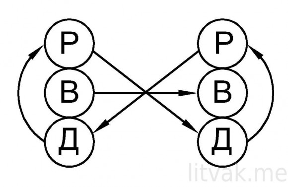 Здесь конфликта нет, и никогда не будет. По линии В-В мы работаем, по линии Д-Д любим, развлекаемся, по линии Р-Р сплетничаем. Данные трансакции протекают так, что в психологическом отношении партнеры равны друг другу. Это трансакции психологического равноправия - первый тип. Анализ параллельных трансакций позволил Берну сформулировать важнейший закон общения: пока трансакции параллельны, процесс общения будет протекать гладко и долго. Конфликта не будет.