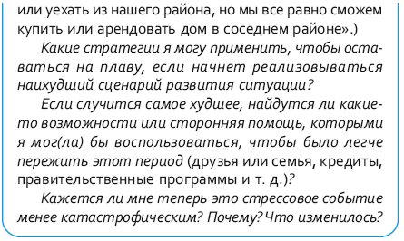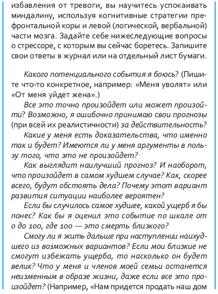 Многие люди драматизируют свое состояние стресса. Они преувеличивают угрозу стрессора и считают его катастрофой, которая разрушает их жизнь. Они также переоценивают вероятность разных бед и несчастий. Стрельба в школе, похищение детей, авиакатастрофа, крах экономики – все это очень плохо, вот только такие происшествия редкость. Журналисты раздувают из таких событий сенсации, чтобы привлечь внимание зрителей или читателей и увеличивать популярность своих СМИ. Большинства вещей, о которых мы беспокоимся, никогда не произойдет. А даже если что-то и случится, мы все равно сможем найти способ выйти из положения или получить поддержку. Но наш мозг не знает об этом, потому что ориентирован на выживание и сосредоточен на том, чтобы избегать повторения неудачного прошлого опыта или печальных событий, о которых мы узнали из СМИ или от других людей.
