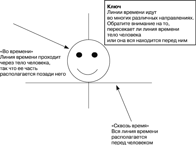 Человек «во времени» сравнивается по Майерс-Бриггс с «перцептивно-ориентированным» типом. Помните, что, если какая-нибудь часть линии времени человека располагается позади его, он живет «во времени». Прошлое человека «во времени» обычно располагается позади него. С другой стороны, человек «сквозь время» видит свое прошлое перед собой (обычно слева). Поэтому прошлое может преследовать человека «сквозь время» сильнее, чем человека «во времени». Оба этих варианта по-своему ценны.