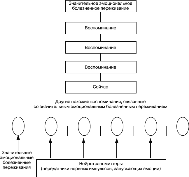 Гештальт или группировка воспоминаний обычно являются результатом того, что мы называем значительными эмоциональными болезненными переживаниями. Значительное эмоциональное болезненное переживание происходит тогда, когда мы встраиваем нечто, полученное при переживании высокой интенсивности. Модель работы на линии времени состоит из гештальта или группировки наших воспоминаний на эмоциональном уровне (см. рис. 16.2.). Я (Б. Б.) убежден в том, что это происходит на нервном уровне и связано с активностью нейротрансмиттеров. Нейротрансмиттеры – это те химические посредники, которые позволяют одной нервной клетке осуществлять коммуникацию с другой. Любой стимул или якорь, который запускает одно воспоминание, будет запускать целый гештальт.