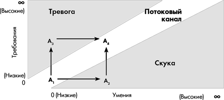 Если он испытывает беспокойство (А3), для возвращения к состоянию потока ему необходимо дальше совершенствовать свои навыки. Заметим, что, хотя теоретически и существует возможность снизить сложность задачи и таким образом вернуться в точку А1, на практике человеку трудно игнорировать новые возможности развития, если он осознал, что они у него есть.