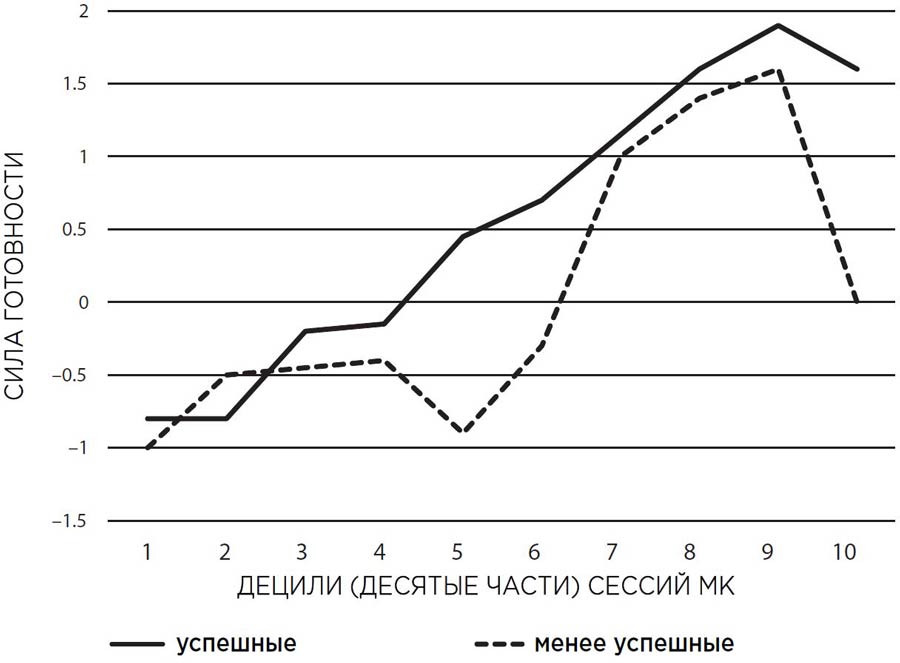 Мы думаем, что произошло следующее. Консультанты в данном исследовании следовали руководству, обеспечивающему согласованность в проведении одной сессии МСТ (мотивационно-стимулирующей терапии), так как клиенты начинали лечение от наркотической зависимости. Они начали с короткого периода МК (сегменты 1–2 в таблице 19.1). Затем психотерапевт обеспечил структурированную оценочную обратную связь (сегменты 3–5), как это предписано в MСT (Miller, Zweben, DiClemente, & Rychtarik, 1992). Когда это задание было закончено, консультант возвращался к свободной манере МК (сегменты 6–9). В заключение все консультанты должны были разработать с клиентом конкретный план изменения в конце сессии (сегменты 9–10). Для двух третей клиентов (сплошная линия) эта последовательность работала хорошо. Но посмотрите на пунктирную линию тех клиентов, которые были менее успешны в результатах. Они начинали с такого же (низкого) уровня готовности, как и преуспевшие клиенты. В ходе процесса обратной связи изменяющее высказывание в успешной группе укрепило свои позиции, но не в отстающей группе. Как только данный этап заканчивается, они реагируют на МК, и их сила готовности возрастает до того же уровня, как и у другой группы. Затем следует план изменения. Видимо, эти клиенты не были готовы взять на себя обязательство по выполнению конкретного плана, но в пособии говорилось, что это так или иначе необходимо было сделать (фактически «готов ли клиент или нет»), и их уровень готовности вновь резко упал до нуля.