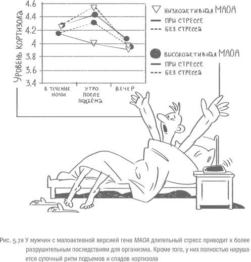 В спокойные времена уровень кортизола выходит на максимум утром, примерно через 30минут после пробуждения. В течение дня и ночи концентрация гормона стресса снижается, чтобы опять подскочить после звонка будильника. Кратковременный стресс вызывает внеплановый скачок кортизола, но затем все возвращается к норме. При длительном стрессе общий уровень кортизола возрастает, однако его динамика остается примерно той же: утреннее повышение, а затем – плавное снижение. У мужчин с малоактивным геном MAOA, которые вынуждены месяцами заботиться о больных родственниках, нет утреннего пика кортизола. Наивысшие показатели по этому гормону наблюдаются ночью, но и они заметно уступают пику носителей "правильной" версии гена. Авторы исследования, которые обнаружили эту аномальную динамику, полагают, что при длительном стрессе ГГНС обладателей малоактивного фермента истощается и выходит из строя. Моноамины регулируют многие параметры ответа на стресс, и при несвоевременной утилизации этих нейромедиаторов начальная встряска ГГНС может оказаться чрезмерной. В первые недели стресса организм носителей малоактивной моноаминоксидазы А реагирует на стресс излишне бурно, и если стрессовое воздействие продолжается, "перегревшаяся" ГГНС отключается. Итог – многочисленные болячки, которые поражают лишенный защиты организм [58].