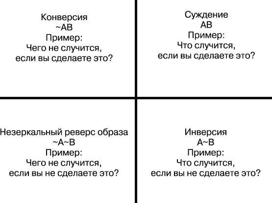 Примечание. На диаграмме, представленной на рис. 5.1, знак ~ символизирует «не». Поэтому эту иллюстрацию следует читать так: суждение = A, B, инверсия = A, не B, конверсия = не A, B, незеркальный реверс образа = не A, не B. Мне (Б. Б.) нравится думать об этом в терминах (—) и (+). При помощи данного способа это читалось бы так: суждение = (+) (+), инверсия = (+) (—), конверсия = (—) (+) и незеркальный реверс образа = (—) (—).