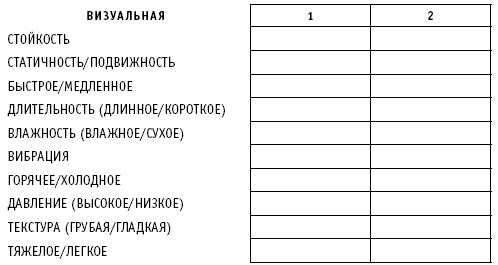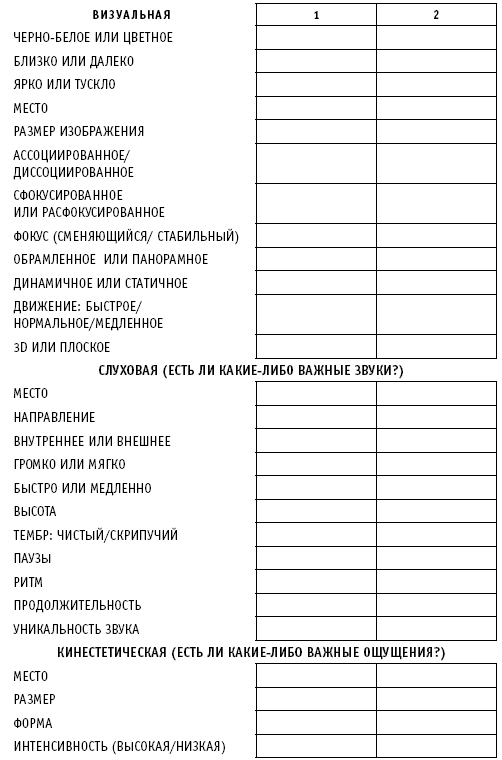 1.?Подумайте о «холодных звонках», составьте мысленный образ, а затем, следуя таблице 9.2, очень быстро (помните совет 9.1) запишите визуальные субмодальности в первый столбец. Спросите себя, есть ли еще какие-либо важные звуки. Если есть, выявите их и заполните столбец слуховых субмодальностей. Повторите то же самое с кинестетическими субмодальностями. Примечание: советую вам пользоваться сокращениями для увеличения скорости (напр., «ч» вместо «черно-белого»).