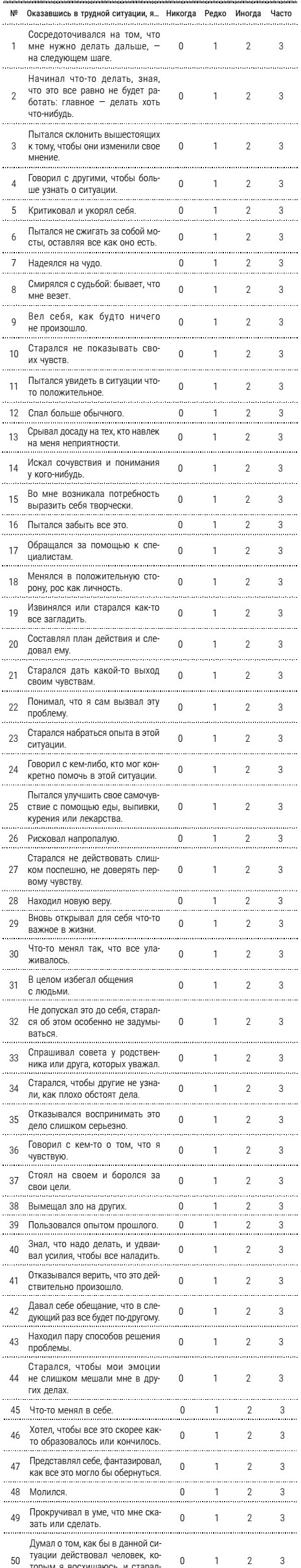 Методика предназначена для исследования механизмов совладания в когнитивной, эмоциональной и поведенческой сферах. Это 50 утверждений, отражающих способы преодоления трудностей в трех основных сферах психической деятельности – когнитивной, эмоциональной и поведенческой. Эти утверждения соответствуют различным вариантам стратегий совладания, к которым человек прибегает в повседневной жизни, сталкиваясь с трудностями.
