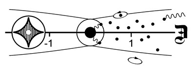 Рис. 7.3. Две области вдоль оси Эдипа. Справа живут истероиды, слева – гипертимы. Жирными точками обозначаются представления. По краям областей становятся заметны переходы либидо в вихревую форму. Если выйти за пределы области, пренебречь вихрем уже нельзя. Слишком близко и слишком далеко от нуля либидо переходит в аффектную форму. В гипертимной области происходит дефокусировка либидо.