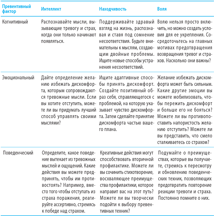 Разработайте собственный превентивный план, указав когнитивные, эмоциональные и поведенческие методы, которые вы будете использовать наряду с вашим интеллектом, находчивостью и волей, чтобы не допустить возвращения тревоги и страха. Затем претворите свой план в жизнь.