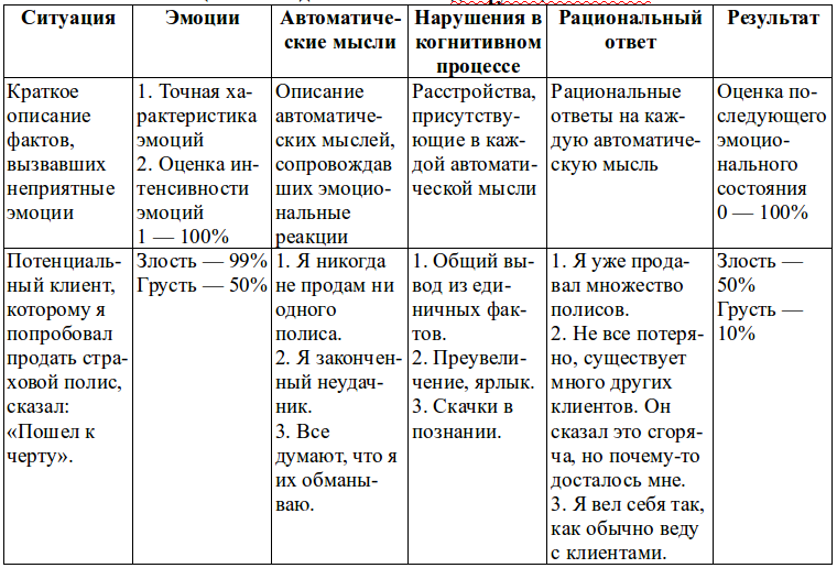 Еще более тщательно разработал подобный метод Аарон Т. Бек: «Ежедневная запись дисфункциональных мыслей», где регистрируются не только автоматические мысли, но и чувства и отрицательные события, вызвавшие их (таблица 4 2).