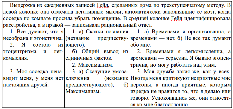 Эффективное средство для осуществления этого — «трехступенчатый метод». Нужно составить таблицу (см. таблицу 4.1), где левая колонка — «автоматические мысли» (самокритика), средняя — «нарушения в процессе познания», правая — «рациональный ответ» (самозащита).