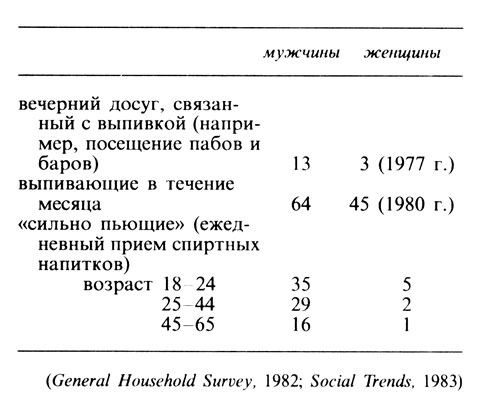 Если судить по результатам исследований 1981 г. (см. табл. 4.7), большинство форм социального досуга связано с приемом спиртных напитков - в пабах и клубах, а также дома.
