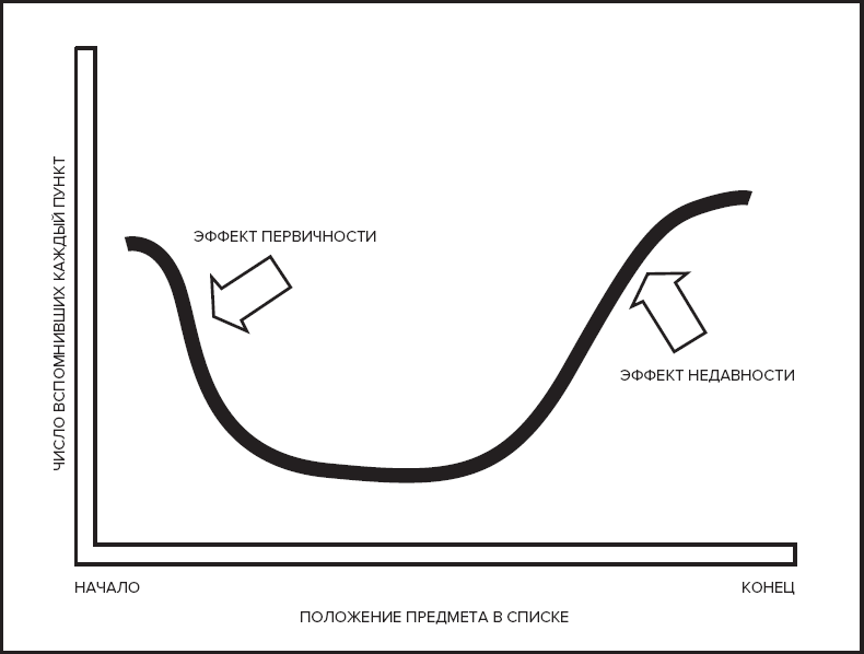 Может, у Мэри проблемы с памятью? Вовсе нет. На самом деле это классический пример: когда нам нужно запомнить список предметов, мы хорошо фиксируем то, что было названо в начале и в конце, а вот пункты из середины списка сохраняются в памяти хуже. Тот факт, что проще запоминаются первые несколько элементов, был назван эффектом первичности. А тот, что хорошо это делают последние пункты, – эффектом недавности. Если попросить сотню разных людей запомнить список покупок Мэри и Джейн и отметить на графике, скольким удастся вспомнить каждый из названных предметов, мы увидим классическую U-образную позиционную кривую.