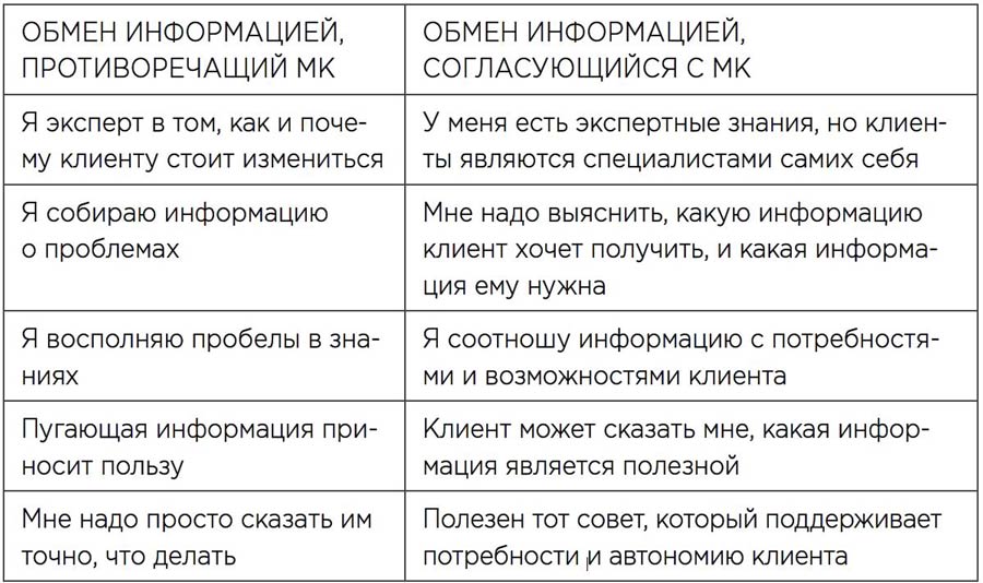 В Таблице 11.1 приведены основные различия между двумя видами обмена информацией: согласующимся и противоречащим принципам МК.
