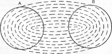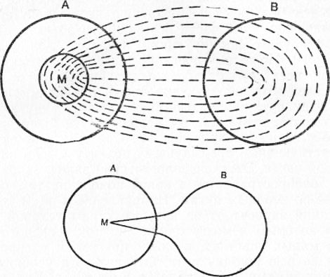 Постепенный переход от полного воспроизведения к ассоциации по сходству посредством того, что мы называли неполным воспроизведением, может быть изображен в виде диаграмм. Рис. 10 изображает полное воспроизведение, рис. 11—неполное, рис. 12 — ассоциацию по сходству. А во всех трех диаграммах изображает тускнеющий объект мысли, В — вновь образующийся. При полном воспроизведении всей части А равно принимает участие в В. При неполном воспроизведении значительнейшая часть А не играет никакой роли в образовании В. Только часть М вызывает В. При ассоциации по сходству часть М значительно меньше, чем в предыдущем случае, и, вызвав новую группу элементов ассоциации, она не стушевывается, но упорно продолжает действовать наряду с ними, образуя тождественную часть в обеих идеях и тем самым делая их сходными.