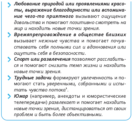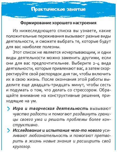 Как вы можете использовать эти результаты исследований позитивных эмоций и состояний ума для лучшего противодействия стрессорам, с которыми сталкиваетесь? Например, вы можете выстроить для себя «план жизнестойкости», в соответствии с которым в качестве профилактики будете активно заниматься видами деятельности, вызывающими у вас позитивные эмоции, и стараться использовать свое хорошее настроение для более беспристрастного осмысления того, что вас беспокоит.